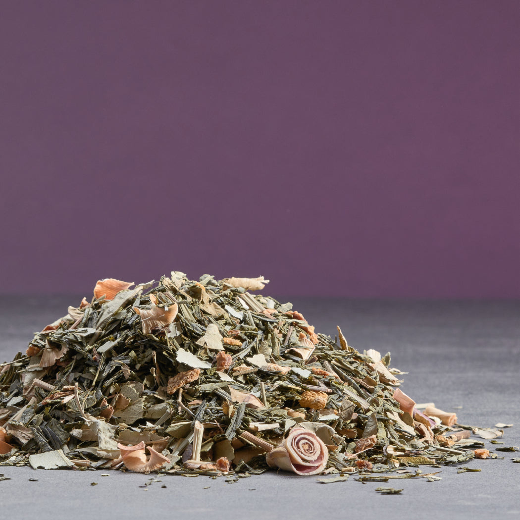 Composition : Thé vert "Sencha" Bio, de Chine, feuille d'eucalyptus Bio, citronnelle Bio, feuille de combawa, zeste de citron.