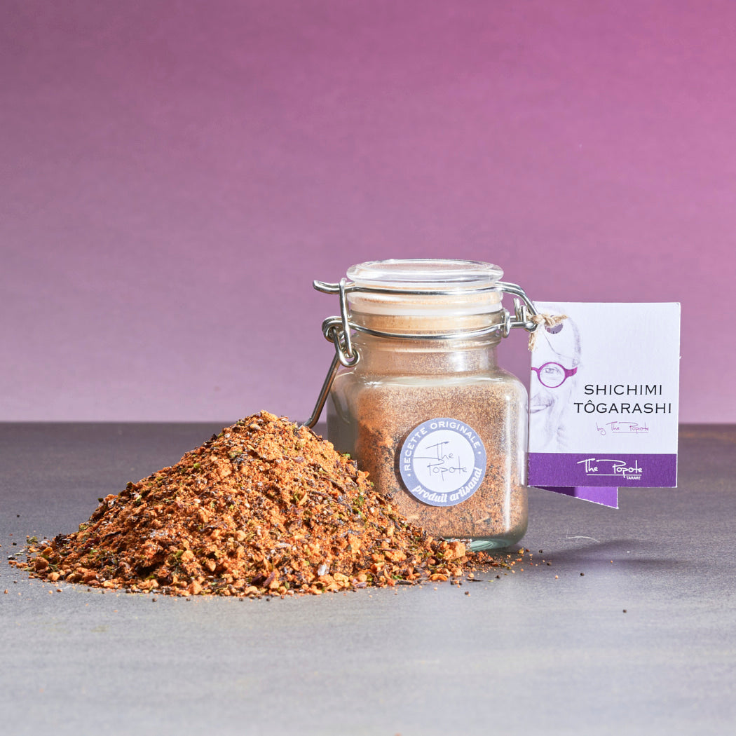 Le "Piment aux 7 parfums" ou le "shichimi togarashi " en langue japonaise est un mélange traditionnel d'épices qui se compose généralement de sept ingrédients différents. Le nom "shichimi" signifie littéralement "sept saveurs" en japonais, tandis que "togarashi" fait référence au poivre rouge piquant contenu dans le mélange.
