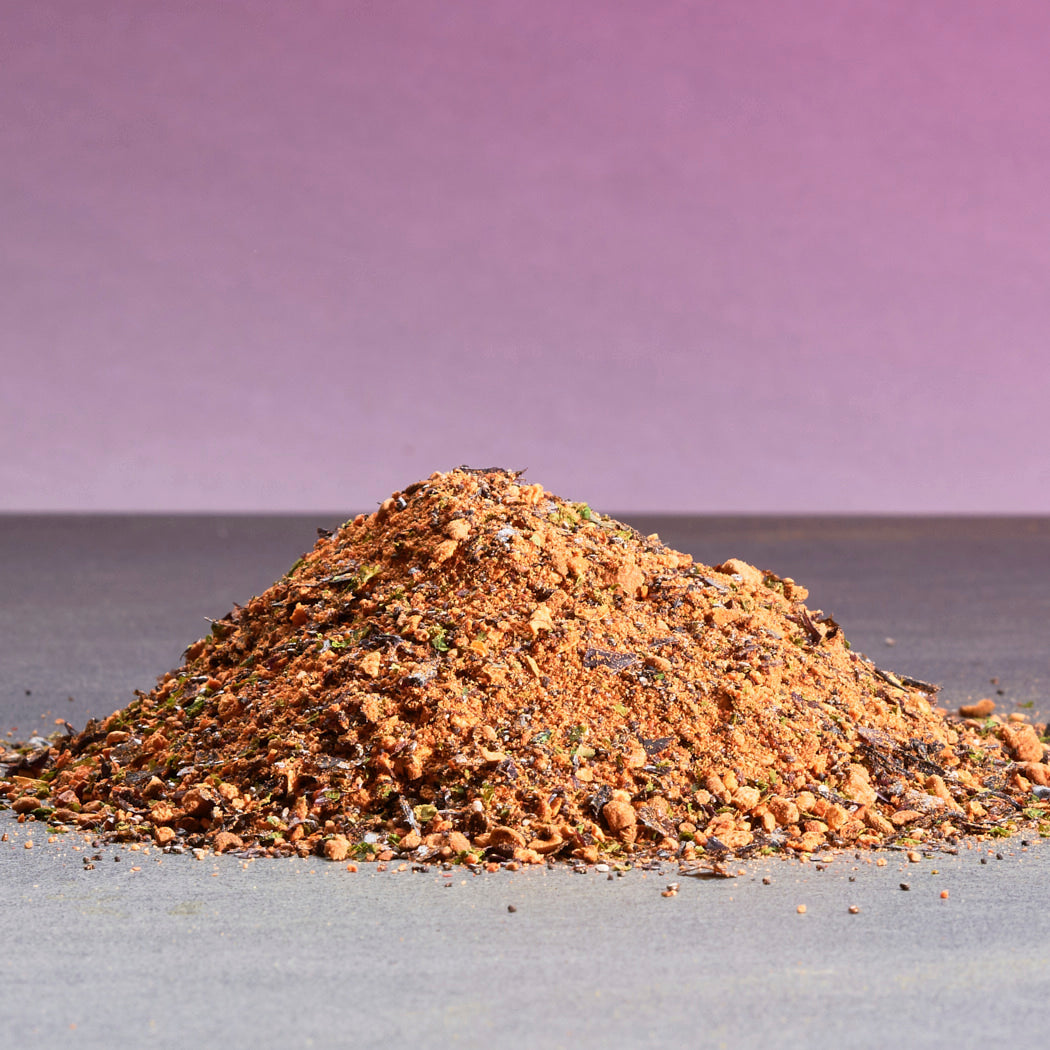 Poivre rouge de Kampot IGP, algues comestibles, zeste de yuzu, paprika Bio, rhizome de gingembre Bio, sucre noir d'Okinawa (Made in Japan), graines de chanvre et de sésame Bio, écorces d'orange Bio.